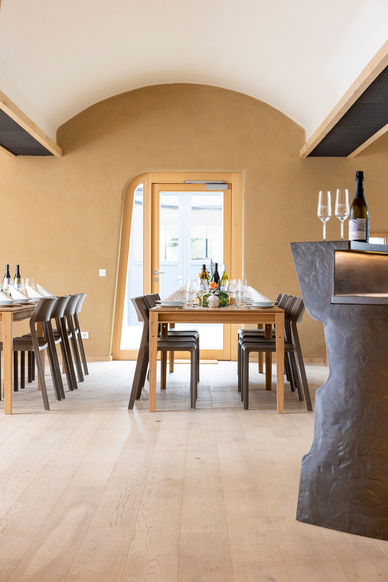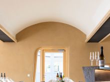 Überaus gelungen ist auch der Neubau der Vinothek. Wir lieferten auch dazu ZiegelGewölbeElemente zum Bau des sogenannten preussischen Kappengewölbes. Mit beschwingter Leichtigkeit überspannt der Gewölbebau den 70 m² großen Raum. Gemeinsam mit den asymmetrischen Fenster- und Türlaibungen und dem Lehmputz wirkt die Architektur bereits auf ganz eigenständige Weise überaus ästhetisch und geschmackvoll.