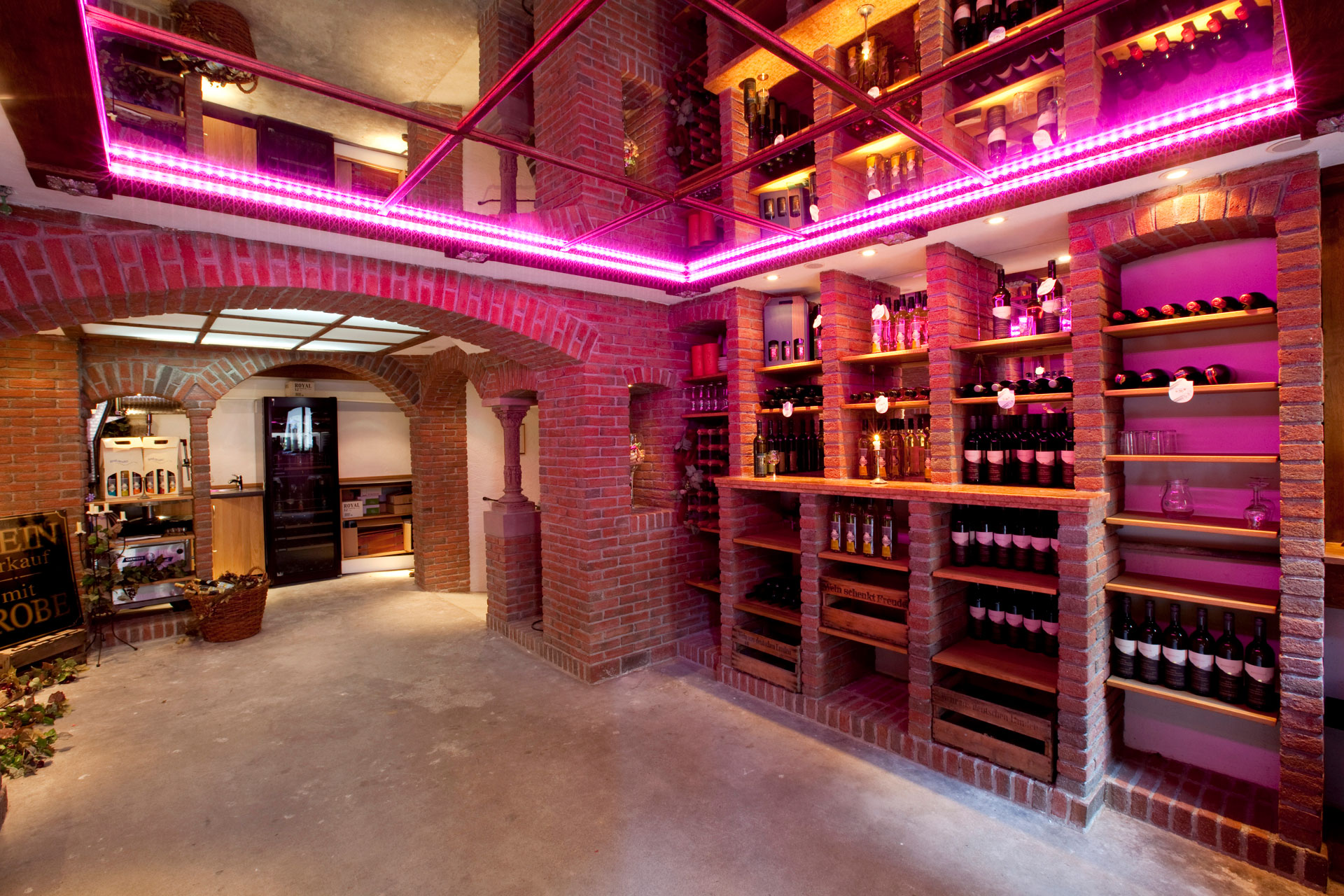 Um dem Raum mehr Größe zu verleihen, wurde im vorderen Bereich ein Deckenspiegel angebracht. Die umlaufende LED - Beleuchtung mit Möglichkeit des Farbwechsels wird durch den Spiegel effektiv verstärkt. Die Wirkung der unterschiedlichen Lichtfarben auf den Raum ist verblüffend. Leicht nachvollziehbar, dass auch die menschliche Sensorik bei der Weinprobe durch Lichtfarben beeinflusst wird und der Wein je nach dem gänzlich anders schmeckt.