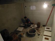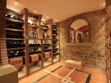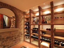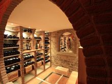 Drei Stufen führen "klimatisch vorteilhaft" auf ein Podest, von hier geht's nach einem weiteren Tritt vollends nach unten. Auf ca. 5 m² bieten hier die auf zwei Seiten raumhoch gemauerten Weinregale übersichtlich Platz für über 1.000 Flaschen Wein. Ein Wandspiegel weitet den Raum optisch.